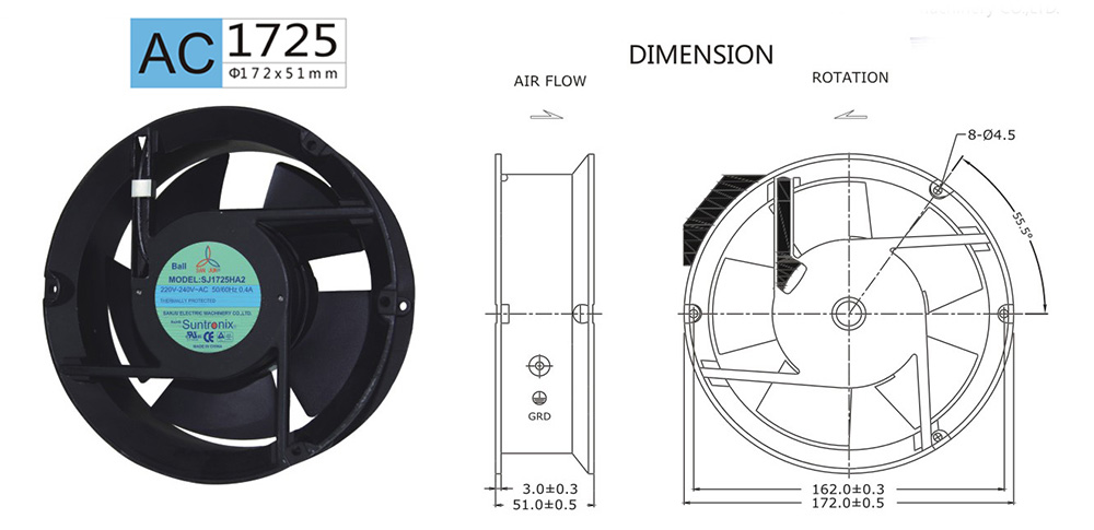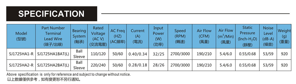 尺寸:172x51mm 框架:鋁ADC-12 軸承:含油軸承& 雙滾珠軸承 電壓:AC 110V 220V 380V440V 壽命:60 000Hours at 20℃--滾珠軸承 30 000Hours at 20℃--含油軸承 工作溫度:-20℃~70℃ 正常濕度 儲存溫度:-20℃~85℃ 正常濕度