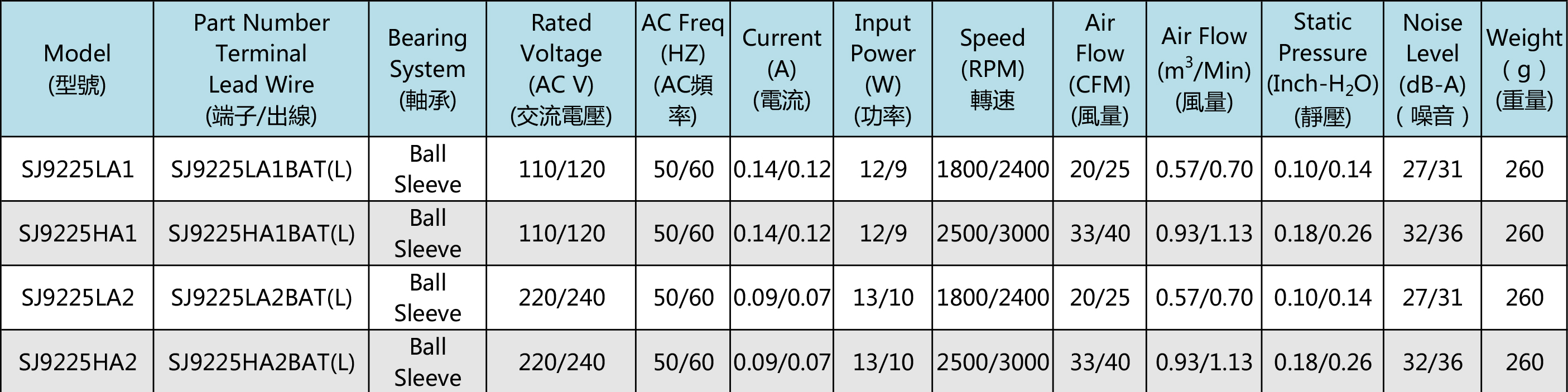 尺寸:92x92x25mm 框架:鋁ADC-12 軸承:含油軸承& 雙滾珠軸承 電壓:AC 110V 220V 380V 壽命:60 000Hours at 20℃--滾珠軸承 30 000Hours at 20℃--含油軸承 工作溫度:-20℃~70℃ 正常濕度 儲存溫度:-20℃~85℃ 正常濕度